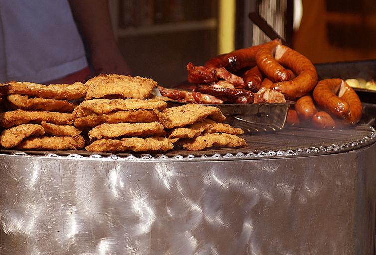 Keywords: spit food eating chops sausage baked breaded sausages meal grate grill burning masarstwo wędliniarstwo preparing a meal
