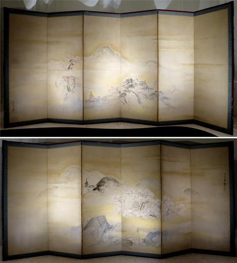 | Keywords: Spring and Autumn Landscapes by Maruyama Okyo, Honolulu Museum of Art, 4607.1a-b.jpg Spring and Autumn Landscapes by Maruyama Ōkyo dated 1766 pair of six-panel screens ink color and gold on paper Honolulu Museum of Art accession 4607 1a-b own dated 1766 Maruyama Ōkyo Japanese screens in the Honolulu Museum of Art Maruyama Ōkyo Maruyama Okyo Cc-zero | ||||
