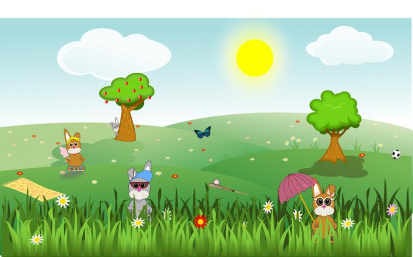 Keywords: spring easter landscape hills trees sun sky clouds rabbits bunnies picnic