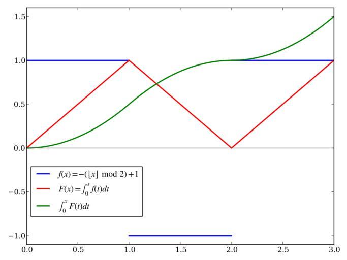 | Keywords: Square signal and its antiderivatives.svg en Square signal and its antiderivatives fr Un signal carré et ses primitives 2012-09-24 15 37 20 own Gapato Python scipy/numpy/matplotlib code from matplotlib pyplot import from numpy import from scipy integrate import cumtrapz def f x return x sin 1/x eps 1e-9 x0 linspace 0 1-eps 100 x1 linspace 1 2-eps 100 x2 linspace 2 3-eps 100 int_x0 1-2 mod modf x0 1 2 int_x1 1-2 mod modf x1 1 2 int_x2 1-2 mod modf x2 1 2 x hstack x0 x1 x2 int_x hstack int_x0 int_x1 int_x2 first_prim cumtrapz int_x x initial 0 second_prim cumtrapz first_prim x initial 0 plot x0 int_x0 color 'blue' lw 2 plot x1 int_x1 color 'blue' label r' f x - \lfloor x \rfloor\ \mathrm mod \ 2 + 1 ' lw 2 plot x2 int_x2 color 'blue' lw 2 plot x first_prim color 'red' label r' F x \int_0 x f t dt ' lw 2 plot x second_prim color 'green' label r' \int_0 x F t dt ' lw 2 ylim -1 1 1 6 axhline 0 color 'gray' legend loc 3 bbox_to_anchor 0 0 1 tight_layout show cc-zero Uploaded with UploadWizard Functions |