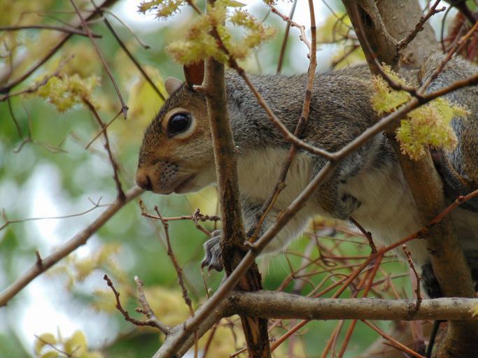 Keywords: squirrel animal forest branch tree nature mammal wild life watching attention outside spring creature cute fur grey small wild sitting rodent