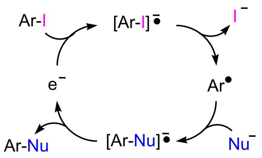 Keywords: SRN1 chain mechanism.svg C - Scheme of SRN1 chain mechanism own work with ChemDraw 2008-03-13 Su-no-G PD Nucleophilic aromatic substitution reactions
