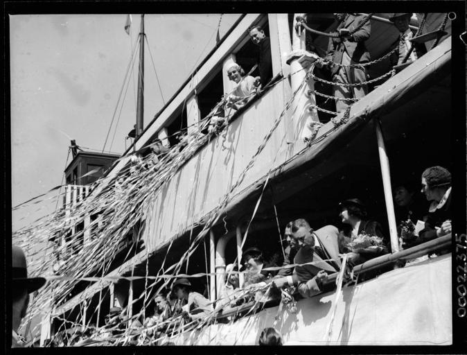 | Keywords: samuel j hood collection samueljhoodcollection hood collection hoodcollection hood morinda burns philp burnsphilp mystery island mysteryisland australian film australianfilm talkie cast crew producer director actors actresses brian abbot brianabbot leslie hay simpson lesliehaysimpson desmond hay desmondhay george rikard bell georgerikardbell grace rikard bell gracerikardbell jean mort jeanmort jean laidley jeanlaidley lost at sea lostatsea motor skiff motorskiff motor launch motorlaunch mystery star mysterystar george doran georgedoran jonas alfred lipman jonasalfredlipman joe lipman joelipman george d malcolm georgedmalcolm farewell streamers vintage vintage clothing vintageclothing walsh bay walshbay 1930s fashion 1930sfashion 1930s women's fashion 1930swomensfashion 1930s women's clothing 1930swomensclothing blackandwhite photo border monochrome diagonal outdoor vehicle boat black and white This photograph depicts the cast and crew members of the Australian film Mystery Island (1937) on board SS MORINDA. The cast and crew were sailing from Walsh Bay, Sydney to Lord Howe Island to shoot the film. Shortly after shooting the film, George Rikard Bell (screen name Brian Abbot) and a fellow cast mate, Leslie Hay Simpson (screen name Desmond Hay), decided to forego the trip back to Sydney on board MORINDA and opted to sail on board the 16-foot motor skiff, MYSTERY STAR. The two were never seen again. Please see our blog for an extended version of the story. This photo is part of the Australian National Maritime Museum’s Samuel J. Hood Studio collection. Sam Hood (1872-1953) was a Sydney photographer with a passion for ships. His 60-year career spanned the romantic age of sail and two world wars. The photos in the collection were taken mainly in Sydney and Newcastle during the first half of the 20th century. The ANMM undertakes research and accepts public comments that enhance the information we hold about images in our collection. This record has been updated accordingly. Photographer: Samuel J. Hood Studio Collection Object no. 00022875 This photograph depicts the cast and crew members of the Australian film Mystery Island (1937) on board SS MORINDA. The cast and crew were sailing from Walsh Bay, Sydney to Lord Howe Island to shoot the film. Shortly after shooting the film, George Rikard Bell (screen name Brian Abbot) and a fellow cast mate, Leslie Hay Simpson (screen name Desmond Hay), decided to forego the trip back to Sydney on board MORINDA and opted to sail on board the 16-foot motor skiff, MYSTERY STAR. The two were never seen again. Please see our blog for an extended version of the story. This photo is part of the Australian National Maritime Museum’s Samuel J. Hood Studio collection. Sam Hood (1872-1953) was a Sydney photographer with a passion for ships. His 60-year career spanned the romantic age of sail and two world wars. The photos in the collection were taken mainly in Sydney and Newcastle during the first half of the 20th century. The ANMM undertakes research and accepts public comments that enhance the information we hold about images in our collection. This record has been updated accordingly. Photographer: Samuel J. Hood Studio Collection Object no. 00022875 |