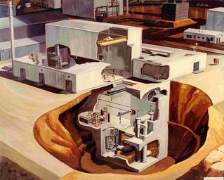 | Keywords: SSFL Building 59 Internal Features.jpg en Santa Susanna Field Laboratory - Building 59 Construction completed in 1965 Designed for long-term testing of SNAP reactors and later modified to perform non-nuclear testing Demolition began in october 2003 Underground test vault 55 feet below the surface Reactor vault and test cell constructed of 3-foot thick concrete and lined with steel Reactor tests performed in vacuum chamber to simulate outer space http //www etec energy gov/library/December-2004-Meeting/Bifold3 pdf U S Department of Energy Systems for Nuclear Auxiliary Power Energy Technology Engineering Center Architectural cutaways PD-USGov |