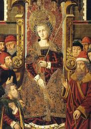 | Keywords: St-helena-enthroned-among-jews-jimenez -bernalt-1480s.jpg Holy Cross Retablo de la Santa Cruz ; Church of Blesa Aragon Spain This panel shows Saint Helena enthroned among the Jews Helena wears a trigregnum symbolizing that she represents the Catholic Church in her quest for the True Cross Spanish-gothic style; oil on wood c 1481-1487 Scanned from Uneasy Communion Vivian B Mann ed 2010 Miguel Jimenez and Martin Bernalt s 1480 PD-old-100 <gallery> File St-helena-enthroned-among-jews-jimenez-bernalt-spain-1480s jpg Smaller version File Jimenez-santa helena y judios JPG Smaller version </gallery> Helena of Constantinople and the finding of the True Cross Altar paintings 15th-century religious paintings in Spain Miguel Ximénez Martín Bernat |