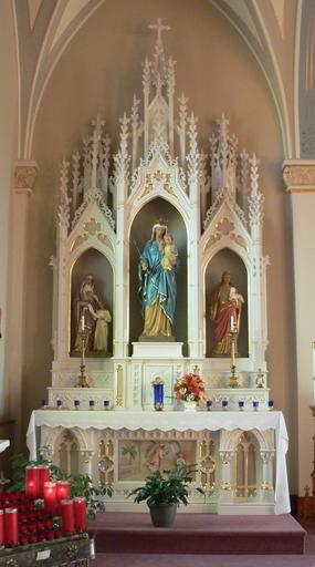 Keywords: St. Helena Immaculate Conception Marian altar.JPG St Helena Nebraska The Gothic Revival church was built in 1897 With the 1919 rectory it is listed in the National Register of Historic Places own Ammodramus 2010-11-01 Cc-zero Pictures by Ammodramus Taken with Panasonic Lumix DMC-FZ20 Immaculate Conception church St Helena Nebraska Altars of Mary in the United States Reredos in the United States |