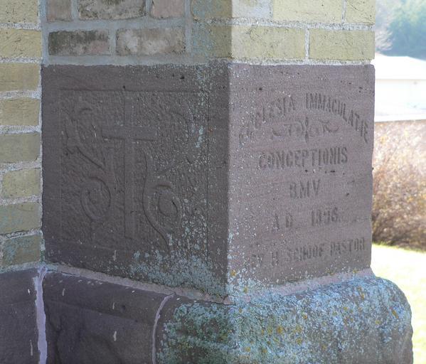 Keywords: St. Helena Immaculate Conception cornerstone.JPG St Helena Nebraska The Gothic Revival church was built in 1897 With the 1919 rectory it is listed in the National Register of Historic Places own Ammodramus 2010-11-01 Cc-zero Pictures by Ammodramus Taken with Panasonic Lumix DMC-FZ20 Immaculate Conception church St Helena Nebraska Corner stones in Nebraska |