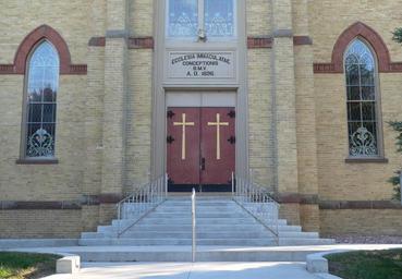 Keywords: St. Helena Immaculate Conception entrance.JPG St Helena Nebraska The Gothic Revival church was built in 1897 With the 1919 rectory it is listed in the National Register of Historic Places own Ammodramus 2010-11-01 Cc-zero Pictures by Ammodramus Taken with Panasonic Lumix DMC-FZ20 Immaculate Conception church St Helena Nebraska Doors in Nebraska Church portals in the United States |