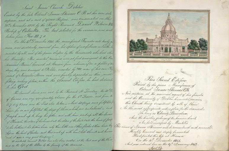 Keywords: St Jame's Church, Delhi, folio from book by Thomas Metcalfe, 1843.jpg St James' Church Delhi folio from Reminiscences of Imperial Delhi ™ an album consisting of 89 folios containing approximately 130 paintings of views of the Mughal and pre-Mughal monuments of Delhi by Thomas Metcalfe 1843 Left Page Saint James ™ Church Delhli Erected by the late Colonel James Skinner C B at his own expense and at a cost of 95 000 Rupees was consecrated on the 21st November 1836 by the Right Reverend Daniel Wilson D D Bishop of Calcutta The text selected for the occasion was well taken from Rev III 7 8 On the 4th December 1841 the munificent Founder and truly good man was suddenly removed from his sphere of usefulness on Earth lamented by all and of the poorer classes by the thousands who had shared his Bounty His Mortal Remains were at first consigned to the Cantonment Burial Ground at Hansi in Hisar district Haryana from whence after a period of 40 days they were conveyed to Delhi escorted by 200 men of his own Regiment of Irregular Horse Skinner's Horse and were finally deposited in their most fitting resting place within the Sacred Edifice he had dedicated to his God The Funeral Service was read by the Reverend H Loveday The 50th Chapter of Genesis was very appropriately chosen for the 1st Lesson and from the 3 7 8 9 verses was the Text also taken And 40 days were fulfilled for him for so are fulfilled the days of those which are embalmed And Joseph went up to bury his father and with him went up all the Servants of Pharaoh the elders of his house all the elders of the land all the house of Joseph his brothers ™ his father ™s house Only their little ones their flocks their herds they left in the land of Goschen and there went up with him both chariots and horsemen and it was a very good Company A suitable mural Tablet has also been erected at the East end of the Church and on the left of the Altar by the family of the deceased St Jame's Church was commissioned by Colonel James Skinner 1778-1841 a distinguished military officer famous for the cavalry regiment Skinner ™s Horse While lying wounded on the field of battle he made a vow that if he survived he would build a church in thanks for his life being saved The church designed by Major Robert Smith was started in 1826 and completed ten years later It is the oldest church in Delhi and is built in the shape of a Greek cross with a dome reminiscent of the Renaissance style Inscribed naqsha-i girjaghar nazd-i kashmiri darwaza Drawings by Mazhar ˜Ali Khan Right Page This Sacred Edifice Raised by the pious Munificence of Colonel James Skinner CB Now contains at the universal request of his friends and the Community of Dehlie his mortal remains this Church being considered by all of them As the most appropriate resting place for the deceased So long as Charity Benevolence and the kindlier feelings of the human heart Are held in respect by Mankind The name of James Skinner will be remembered and revered Highly honored and deeply lamented He departed this life at Hansee on the 4th December 1841; And was interred on the 19th January 1842 Aged 64 http //www bl uk/onlinegallery/onlineex/apac/addorimss/s/019addor0005475u00007vrb html Thomas Metcalfe 1795-1853 1843 PD-Art Reminiscences of Imperial Delhi Metcalfe House James Skinner St James' Church Delhi Paintings by Mazhar Ali Khan British Library