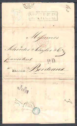 | Keywords: St Petersburg 1848 Dob0102306.jpg en Russia stampless folded letter to France 'St PETERSBURG DEN 24 IAN 1848 ' boxed cancel manuscript 'franco tout' Black 'P D ' straight line 'AUS RUSSLAND FRANCO' French 'PRUSSE VALENCIENNES 15 FEVR 48' c d s Transit postmark Paris and Bordeaux 17 FEVR 48 arrival Details January 24 1848 Julian paid letter posted at St Petersburg Sender wrote 'franco tout' Not restated at post office The postmark 'St PETERSBURG DEN 24 IAN 1848' was applied Dobin 1 02 type 3 06 Reception expedition of foreign correspondence used 1844-1853 Rarity 4 <ref> cite book Manfred Dobin Postmarks of Russian Empire Pre adhesive period St Petersburg Standard Kollektion 1993 9785853870222 </ref> February 11 Gregorian 'BERLIN 11 2' typical Berlin transit postmark and 'AUS RUSSLAND FRANCO' applied Based on the usual presence of these Berlin postmarks this 'AUS RUSSLAND FRANCO' marking is regarded as a Berlin mark White Aus Russland type B3 February 15 red 'PRUSSE VALENCIENNES 15 FEVR 48 3' French entry mark at Valenciennes 3's show the postmark was struck at Paris Letter was also marked by the French with 'P D ' Payee au Destination Noël 1021<ref> cite book Gilbert Noël Catalogue des oblitérations des chiffres-taxe carrés de France 1859-1878 1956 Paris E H de Beaufond </ref> February 15 blue 'PARIS 15 FEVR 48 60 ' transit postmark February 17 'BORDEAUX 17 FEVR 48 32 ' arrival backstamp 1848 Scan of original Postal authorities Sources reflist PD-old-100 Stampless covers of Russia Marque d'entrée en France Gare de Valenciennes Postmarks of Saint Petersburg Entry and transit postmarks of Germany 1848 postmarks |
