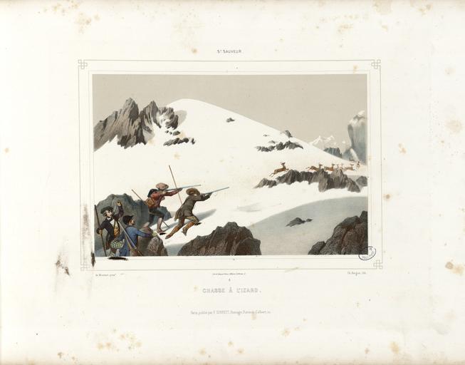Keywords: St. Sauveur - Chasse à l'izard (i.e. isard) - Fonds Ancely - B315556101 A MONTAUT 010.jpg Fait partie de deux albums réunis et publiés par F Sinnett à Paris Lith de Becquet frères à Paris Les planches du premier album ont été dessinées par Montaut et lithographiées par Bargue Les planches du second album ont été dessinées et lithographiées par Charles Maurice Le titre du premier album est lithographié Le premier album est signalé dans la bibliographie pyrénéiste de Jacques Labarère comme étant très rare Pièce jointe photocopie en n et b d'une lithographie de Montaut intitulée Col de Tortes - Traversée de la montagne Ancely René 1876 - 1966 Possesseur fre public domain domaine public B315556101_A_MONTAUT_010 jpg image/jpeg 1 f de pl lithogr ; 30 cm oblong Sinnet F Éditeur Bargue Charles 1826 -1883 Lithographe Becquet 18 - 18 ; imprimeur Lithographe http //numerique bibliotheque toulouse fr/collect/general/index/assoc//ark /74899/B315556101_A_MONTAUT_010 dir/B315556101_A_MONTAUT_010 jpg A-MONTAUT 8 http //catalogues toulouse fr/web2/tramp2 exe/do_keyword_search/log_in setting_key BMT1 servers 1home query p001735 vignette http //numerique bibliotheque toulouse fr/collect/general/index/assoc//ark /74899/B315556101_A_MONTAUT_010 dir/B315556101_A_MONTAUT_010_thumb jpeg by 1852 St Sauveur - Chasse à l'izard i e isard B315556101_A_MONTAUT_010 woodblock print - lithography - engraving - colors - color lithograph Rupicapra pyrenaica Bags Hunters Batons Male clothing Rocks Redingotes in art Trousers French national costumes Mountains of France in art Rifles in art Shoes Hats Men Gaiters Caps Luz-Saint-Sauveur Jackets Hunting in France