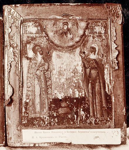 | Keywords: St vladimir rjevskiy.jpg ru Икона с изоб ажением князя Владими а и княгини Аг иппины в молении облачному Спасу с нимбами Снизу надпись «Икона Князя Владими а и Княгини Аг ипены поже твована И А К ыжовымъ г Ржевъ » Тве ской музейный а хив Library of Congress Prints and Photographs Division Washington D C 20540 USA Reproduction Number LC-DIG-prok-02385 Фотог аф С П окудин-Го ский 1910 PD-art Icons of Tver Icons of princes of Russia Damaged icons | ||||