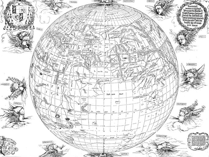 | Keywords: Stabius map of the world II.jpg en Johann Stabius's 1515 world map whose engraving is credited to Albrecht Dürer A planisphere globe surrounded by the twelve winds equivalent to Ptolemy's third projection The arms of Matthäus Cardinal Lang von Wellenburg archbishop of Salzburg at upper left; the arms of Johann Stabius imperial astrologer at lower left Dedication to Cardinal Lang at upper right; imperial privilege and date at lower right As no 16th-century copies are known to survive and the image lacks the subtitle of Adam von Bartsch 1757-1821 's 1781 reprint it is presumably from Carl Ritter 1779-1859 's 1847 edition la Reverendiss domino et illustriss Principi Dño Matheo T Angeli Diacono Cardinali Gurceñ Sa Caẽs Mtis per Italia locũtenenti generali vdño suo colen Joañ Stabius Au hãc orb imaginem dedicat Imp Caes niuus Maximilianus P F Aug Privilegio caiut nequis Libros membraenas cartas pictu'as volumĩa vel quecuqe alia que Ioan Stabius Au sub suo titulo nomie emiserit sine sua expressa voluntate In decem annis a die editioĩs sequentibus imprimat sub pena amissionis rerum impressarum decem mâcharum auri puri 1 5 1 5 1847 http //www buzemann de/luther/ Das Weltbild Martin Luthers Johann Stabius after Ptolemy c other versions <gallery> File Stabius map of the world jpg File Stabius-Durer world map jpg </gallery> PD-old-70-1923 Maps in Latin Stabius world map 1847 Carl Ritter 1847 maps 1840s maps of the world |