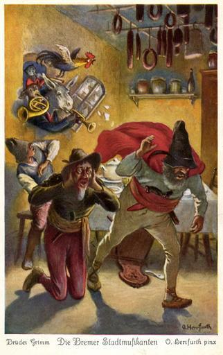 MAKE A MEME View Large Image Stadtmusikanten 4 Herrfurth 500x795.jpg Die Bremer Stadtmusikanten Postkartenserie nach dem Märchen der Brüder Grimm <br />Serie von sechs Postkarten der Firma Uvachrom Gesellschaft für Farbenphotographie m b H München - Stuttgart Serie ...