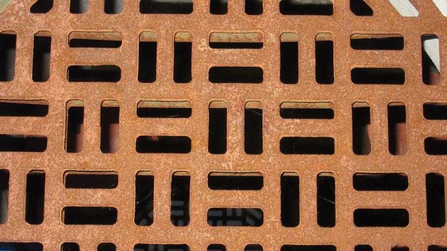 Keywords: stainless manhole cover squares rectangles rusty red metal pattern structure background