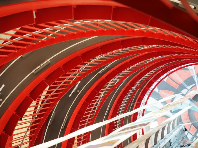 Keywords: staircase futuristic architecture locomotion drive rise descent red building interior art