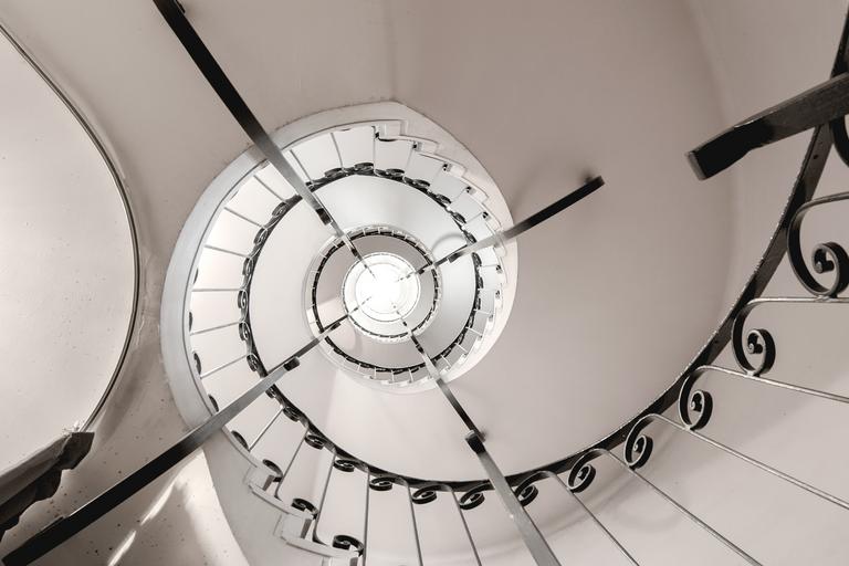 Keywords: staircase looking up white indoors stairway stairs spiral architecture interior railing