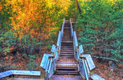 Keywords: staircase woods trees autumn forest wild woody plants fall seasons outdoors stairway steps paths pathways thick dense flora leaves leafy branches stems yellow golden foliage bushes shrubs gardens parks walkway environment scenic colorful