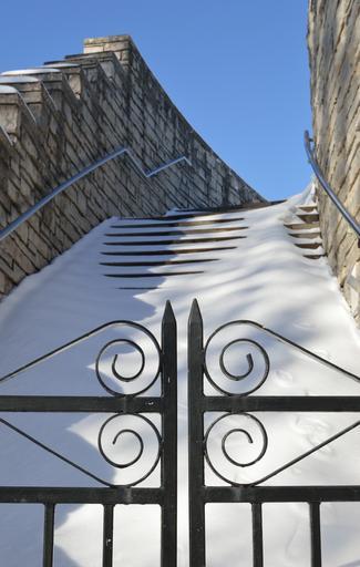Keywords: stairs gate iron gate snow winter season architecture