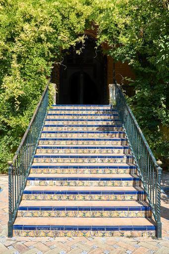 Keywords: stairs input gradually emergence architecture building staircase rise stone stairs entrance door arched door railing treppengeländer uncertain dark despair fear unknown darkness tiles stone tiles tile iron railings climber nature overgrown green leaves bush hops stair step light