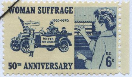 Keywords: Stamp-US-1970-Woman-Suffrage.png en Commemoration of the 1970 anniversary of the 19th Amendment to the U S Constitution; the amendment was ratified in 1920 and provided for women's suffrage Stamp collectors likely often refer to the stamp as U S Scott 1406 United States Postal Service or the predecessor postal agency of the U S government of the time Ward Brackett designer 1970-08-26 Fair use or public domain the stamp being from 1970 probably not copyrighted <http //www usps com/rightsandpermissions/fair-use-exceptions htm> as accessed Apr 27 2011 Stamp and what appears on attached original paper often known as selvage unless in the public domain but not subsequent enhancement arrangement and other work © 1970 United States Postal Service All rights reserved Reservation of rights is as asserted by the United States Postal Service I'm unaware of any copyright or other legal restriction on this stamp that does not apply to modern U S stamps generally The design includes the words WOMAN SUFFRAGE 50<sup>TH</sup> ANNIVERSARY 1920-1970 VOTES <small>FOR WOMEN</small> and RIGHT <small>TO</small> VOTE The left image in the stamp appears to represent part of a demonstration in or before 1920; among the women is one man in the car driver's position The right image appears to represent a modern ca 1970 woman casting a vote at a lever-operated voting machine The whole image was made from an actual mint stamp that I owned when I scanned it An oblique line at the top left across the W the line made from overlaying a thread is for legal compliance for more flexibility with reproductions of a postage stamp Scanning relied on Photoshop in Professional scanning mode on a Windows platform Apr 27 “28 2011; settings included RGB rather than CMYK etc 32 bits 1200 pixel/inch and 1200 dpi 24-bit; these data may seem self-contradictory but I think some was from Photoshop itself and the rest from the scanner driver Subsequent file preparation was with Gimp 2 6 2 software on a Linux platform before uploading and did not include any modifications or repairs to the whole image; any image defects were left intact Horizontality adjustment was not necessary and was not attempted due to a risk of lowering the resolution PD-USGov Demonstrations and protests in support of feminism Suffragettes United States Constitution on stamps Feminists from the United States Political rallies Legal history of the United States Political history People voting Voting machines Groups of women in the United States Standing women on stamps People of the United States on stamps Flags of the United States on stamps Machines on stamps Automobiles on stamps Males on stamps 1970 in the United States 1970 stamps Women's suffrage in the United States Blue stamps