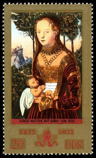 Keywords: Stamps of Germany (DDR) 1972, MiNr 1770.jpg Information 500 Geburtstag von Lucas Cranach d Ä žJunge Mutter mit Kind Ausgabepreis 20 Pfennig First Day of Issue / Erstausgabetag 4 Juli 1972 Auflage 7 000 000 Entwurf Naumann Druckverfahren Rastertiefdruck Michel-Katalog-Nr Ländercode-MiNr 1770 Eigener Scan Bearbeitung Frühjahr 2010 Hochgeladen und Bearbeitet von --Nightflyer <span class signature-talk >talk</span> 20 45 10 September 2010 UTC Gemälde PD-old-100 Rest PD-ineligible German stamps review keep 1972 stamps of the German Democratic Republic Paintings on stamps of Germany Portraits by Lucas Cranach I Portraits of mother and child Horst Naumann |