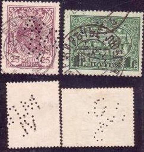 | Keywords: Stamps of the Russian Empire perfin cancelled.png en Stamps of the Russian Empire cancelled with perfins 1910s Definitive stamp 25k and 1r stamp from the commemorative issue of 1913 300th anniversary of the Romanov dynasty Moscow Kremlin en Почтовые ма ки Российской импе ии имеющие вто ичное гашение п околом в виде пе финов 1910-е годы номиналом 25 коп станда тная ма ка и 1 уб осковский к емль из юбилейной омановской се ии 1913 года s 1910 http //skandinav eu/page3a3 htm skandinav eu Post Office of the Rissian Empire other versions PD-RusEmpire Definitive stamps of Russia Stamps of Russia 1913 300 years of Romanovs Moscow Kremlin on stamps Postmarks of the Russian Empire Stamps with remainder marks Various stamps in one image Perfins Stamps of Russia to be categorised by subject |