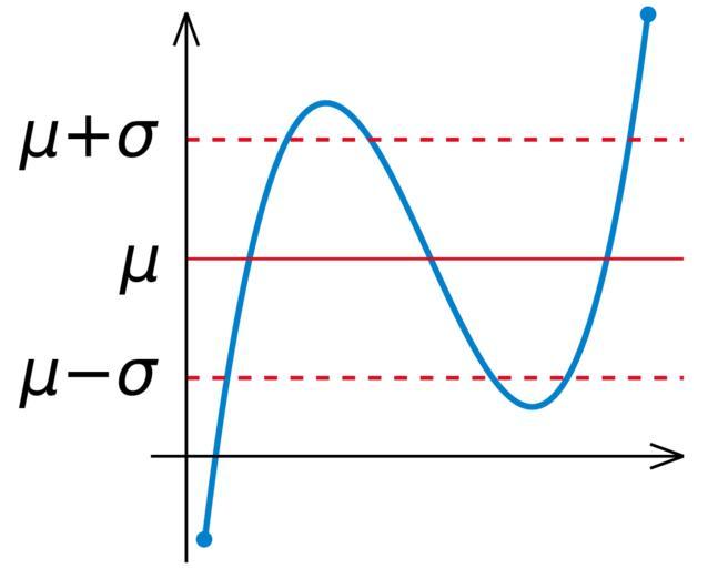 | Keywords: Standard deviation.svg Illustration of en Standard deviation self-made with MATLAB Tweaked in Inkscape 04 55 4 August 2007 UTC Oleg Alexandrov 04 55 4 August 2007 UTC PD-self Source code MATLAB <source lang Matlab > Illustartion of standard deviation function main a -1 2; b 1 3; c -0 5; d 2 5; N 100; X linspace a b N ; Y X 3-0 2 X 2-X+2; Y X 2; scale Y to fit in the plotting window Y Y-min Y / max Y -min Y ; Y Y d-c +c; mean sum Y /length Y ; stdev sqrt sum Y-mean Y-mean /length Y ; figure 1 ; clf; hold on; axis off; axis equal; lw 3; linewidth lw2 lw/2; lw3 lw/1 5; fs 30; font size red 0 867 0 06 0 14; blue 0 129 205/256; green 0 200 70/256; black 0 0 0; plot the curves shiftl a-0 1; small 0 2; plot X Y 'linewidth' lw 'color' blue ; plot shiftl max X +small mean mean 'linewidth' lw2 'color' red ; plot shiftl max X +small mean mean+stdev 'linewidth' lw3 'color' red 'linestyle' '--' ; plot shiftl max X +small mean mean-stdev 'linewidth' lw3 'color' red 'linestyle' '--' ; plot some balls for beauty n length X ; ball_rad 0 03; ball X 1 Y 1 ball_rad blue ball X n Y n ball_rad blue axes small 0 2; arrowsize 0 2; arrow_type 0; angle 20; in degrees arrow shiftl-0 2 0 b+0 2 0 lw2 arrowsize angle arrow_type black arrow shiftl min Y-0 1 shiftl max Y lw2 arrowsize angle arrow_type black text small1 0 3; small2 0 3; text shiftl-small1 mean '\mu' 'fontsize' fs text shiftl-small1-small2 mean+stdev '\mu+\sigma' 'fontsize' fs text shiftl-small1-small2 mean-stdev '\mu-\sigma' 'fontsize' fs H text 0 1 -0 1 'x_ n+1 ' ; set H 'fontsize' fs H text 0 7 -0 1 'x_ n ' ; set H 'fontsize' fs save to disk saveas gcf 'Standard_deviation eps' 'psc2' plot2svg 'Standard_deviation svg' ; function arrow start stop thickness arrow_size sharpness arrow_type color Function arguments start stop start and end coordinates of arrow vectors of size 2 thickness thickness of arrow stick arrow_size the size of the two sides of the angle in this picture -> sharpness angle between the arrow stick and arrow side in degrees arrow_type 1 for filled arrow otherwise the arrow will be just two segments color arrow color a vector of length three with values in 0 1 convert to complex numbers i sqrt -1 ; start start 1 +i start 2 ; stop stop 1 +i stop 2 ; rotate_angle exp i pi sharpness/180 ; points making up the arrow tip besides the stop point point1 stop - arrow_size rotate_angle stop-start /abs stop-start ; point2 stop - arrow_size/rotate_angle stop-start /abs stop-start ; if arrow_type 1 filled arrow plot the stick but not till the end looks bad t 0 5 arrow_size cos pi sharpness/180 /abs stop-start ; stop1 t start+ 1-t stop; plot real start stop1 imag start stop1 'LineWidth' thickness 'Color' color ; fill the arrow H fill real stop point1 point2 imag stop point1 point2 color ; set H 'EdgeColor' 'none' else two-segment arrow plot real start stop imag start stop 'LineWidth' thickness 'Color' color ; plot real stop point1 imag stop point1 'LineWidth' thickness 'Color' color ; plot real stop point2 imag stop point2 'LineWidth' thickness 'Color' color ; end function ball x y r color Theta 0 0 1 2 pi; X r cos Theta +x; Y r sin Theta +y; H fill X Y color ; set H 'EdgeColor' 'none' ; </source> Standard deviation Images with Matlab source code Files by User Oleg Alexandrov from en wikipedia |