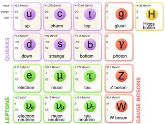Keywords: Standard Model of Elementary Particles.svg en Standard model of elementary particles the 12 fundamental fermions and 4 fundamental bosons Brown loops indicate which bosons red couple to which fermions purple and green Please note that the masses of certain particles are subject to periodic reevaluation by the scientific community The values currently reflected in this graphic are as of 2008 and may have been adjusted since For the latest consensus please visit the Particle Data Group website linked below fr Modèle standard des particules élémentaires les 12 fermions et les 5 bosons En beige les groupes d'interaction Les valeurs d'énergie sont régulièrement mises à jour et peuvent avoir changé ro Modelul standard al particulelor fundamentale 12 fermioni 6 cuarcuri și 6 leptoni la care se adaugă tot atâtea antiparticule corespondente și 12 particule de etalonare bosoni și anume 3 bosoni vector slabi W<sup>+</sup> W<sup>-</sup> și Z<sup>0</sup> 8 gluoni diferențiați de sarcina color și 1 foton Acestora li se adaugă încă 2 bosoni teoretici bosonul Higgs și gravitonul nelistat în tabelul de mai sus De avut în vedere faptul că masele anumitor particule constituie subiectul reevaluării periodice ale comunității științifice Valorile reflectate de acest tabel în momentul de față datează din 2008 și e posibil să fi suferit ajustări Pentru ultimele consensuri puteți accesa situl Particle Data Group listat mai jos Own work by uploader PBS NOVA http //www pbs org/wgbh/nova/elegant/ http //www fnal gov/pub/inquiring/matter/madeof/index html Fermilab Office of Science United States Department of Energy http //pdg lbl gov/ Particle Data Group MissMJ 2006-06-27 Standard Model of Elementary Particles fi svg Standard Model of Elementary Particles it svg मानक प्रतिमान svg Standard Model of Elementary Particles tr svg Standard Model of Elementary Particles-ar png Standard Model of Elementary Particles-ca svg Standard Model of Elementary Particles-de svg Standard Model of Elementary Particles-es svg Standard_Model_of_Elementary_Particles-fr svg Standard Model of Elementary Particles-ga svg Standard Model of Elementary Particles-gl svg Standard Model of Elementary Particles-he svg Standard Model of Elementary Particles hr svg Standard_Model_of_Elementary_Particles_hy_png png Standard Model of Elementary Particles-id svg Standard Model of Elementary Particles-ml png Modelul standard al particulelor fundamentale svg Standard Model of Elementary Particles-sv svg Standard Model of Elementary Particles-vi svg standard modelof elements ar png Standard Model of Elementary Particles-ee svg Partikloj_laŭ_Standarda_Modelo svg Standard Model of Elementary Particles modified version svg Standard Model of Elementary Particles afr svg <gallery> File Standard Model of Elementary Particles afr svg Afrikaans File Standard Model of Elementary Particles-ar png العربية File Standard Model of Elementary Particles hu svg Magyar File Standard Model of Elementary Particles hr svg hrvatski File Standard Model of Elementary Particles mk svg акедонски File Standard Model of Elementary Particles ru svg File Standard Model of Elementary Particles-vi svg Tiếng Việt File Standard_Model_of_Elementary_Particles-fr svg Français File मानक प्रतिमान svg हिन्द File Standard Model of Elementary Particles modified version svg More obviously-colored force groups File مدل استاندارد ذرات بنیادی نسخه تغییریافته png فارسی </gallery> References cite web Fehling Dave http //www pha jhu edu/~dfehling/ The Standard Model of Particle Physics A Lunchbox's Guide The Johns Hopkins University 2008-12-03 For the original version cc-by-3 0 For the derived version Cush Standard Model physics Bosons |