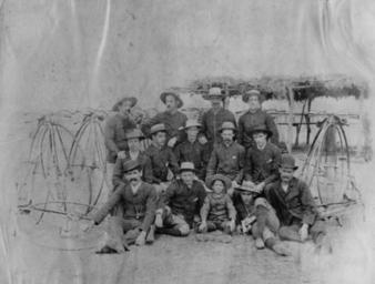 Keywords: StateLibQld 1 100312.jpg en Group photograph of cyclists taken in Charters Towers Queensland ca 1887 <br /> Penny-farthing riders posing with their bicycles surrounding them Possibly a cycling club The name penny-farthing refers to British penny and farthing coins one much larger than the other so that the side view resembles a penny leading a farthing Information taken from Herlihy David V 2004 Bicycle The History Yale University Press ~ 1887 handle 10462/deriv/69398 Item is held by John Oxley Library State Library of Queensland PD-Australia StateLibQld-License Bicycles in Queensland People of Charters Towers Black and white photographs Penny-farthings Images from the State Library of Queensland |