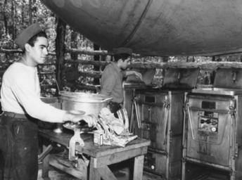 Keywords: StateLibQld 1 100692.jpg en U S Army cooks in an Australian bush camp 1942 U S Army kitchen in an Australian bush camp One cook turns rissoles on the gas stove and the other turn the grinder affixed to the wooden kitchen table 1942-08-05 handle 10462/deriv/68894 Copied and digitised from an image appearing in the Courier-mail 5 August 1942 p 4 Contributor s Courier-mail Brisbane Qld PD-Australia StateLibQld-License World War II field kitchens Military people of Australia 1942 in Australia Black and white photographs History of Queensland/World War 2/Camp Cable Images from The Courier-Mail