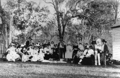 | Keywords: StateLibQld 1 101568.jpg en Picnic at Knapps Creek School 1899 Parents and students' picnic on the grounds of the Knapps Creek School The party stands or sits around a blanket laden with food Most people are well-dressed for the occasion Part of the school building can be seen to the left and trees are visible in the background 1899 handle 10462/deriv/68177 Item is held by John Oxley Library State Library of Queensland PD-Australia StateLibQld-License State schools in Queensland | ||||