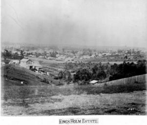 Keywords: StateLibQld 1 102504 Kings Holm Estate, Highgate Hill, looking towards Brisbane, ca.1889.jpg en Kings Holm Estate Highgate Hill looking towards Brisbane ca 1889 Sloping land offered for housing Some of the lots are already fenced and the property in the foreground has a timber home with tanks sheds and an outhouse Settlement is closer in the middle distance circa 1889 handle 10462/deriv/89767 Item is held by John Oxley Library State Library of Queensland PD-Australia StateLibQld-License Cityscapes in Queensland Countryside in Australia Highgate Hill Queensland 1889 in Queensland Black and white photographs |