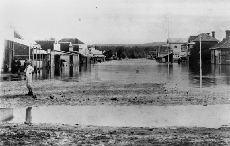 Keywords: StateLibQld 1 112376 Flooded Albion Street, Warwick, 1887.jpg en Flooded Albion Street Warwick 1887 The second highest flood in the entire history of Warwick reached its peak at 3 30am on 22 January 1887 causing much damage and loss of life 'From the junction of the Albion and Fitzroy Streets and thence eastward to the old hospital the whole country was nothing but one mass of turbulent water threatening destruction in every roar which in itself was unpleasant to hear ' Information from the Warwick Examiner 26 January 1887 Left of the photograph businesses include Brown Bros shoe shop C C Clarke' confectioner's shop Right hand side of the photograph Lands Office and the Harp of Erin Hotel 1887 handle 10462/deriv/133024 Item is held by John Oxley Library State Library of Queensland PD-Australia StateLibQld-License Hotels and pubs in Warwick Queensland 1887 Queensland floods Floods in Warwick Queensland Streets in Warwick Queensland 1887 in Queensland Black and white photographs of Australia in the 1880s Shops in Warwick Queensland |