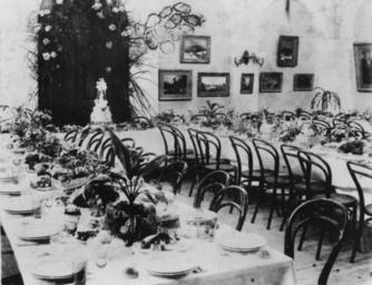 <strong>Description: </strong>Tablecloths are laid and the crockery, cutlery and glasses await the wedding party and guests. The wedding cake is at the head of the table, where the bride and groom will sit. Decorations include pot plants on the tables and a palm leaf wall hanging behind the bride and groom. Decorated for the wedding of Miss Eveline Mary Griffith, daughter of the Honorable Sir Samuel Griffith, Chief Justice of Queensland and Mr Thomas Herbert Brown at St. John's Anglican Cathedral, Wednesday, 28 November 1894. (Description supplied with photograph.)