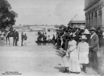 Keywords: StateLibQld 1 116864 Flood scene at intersection Elizabeth Street and Creek Street, Brisbane.jpg en Flood scene at intersection Elizabeth Street and Creek Street Brisbane including a crowd of men women and children on the corner men in a boat and a man on a horse In the background across the water is the sign for 'Queensport Aquarium' and a part of Kangaroo Point is visible in the distance 1890 handle 10462/deriv/140075 Item is held by John Oxley Library State Library of Queensland PD-Australia StateLibQld-License Elizabeth Street Brisbane 1890 Brisbane flood Clothing of Australia 1890 in Queensland Black and white photographs |