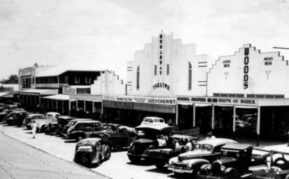 Keywords: StateLibQld 1 120360 Broadway Picture Theatre on Callide Street, Biloela in 1949.jpg en Broadway Picture Theatre on Callide Street Biloela in 1949 after the Second World War Two buildings flank the Broadway Cinema including Woods General Store The facades of the three buildings are influenced by the Art-deco style There are few spaces left in the central parking area 1949 handle 10462/deriv/109056 Item is held by John Oxley Library State Library of Queensland PD-Australia StateLibQld-License Art Deco architecture in Australia Cinemas in Australia Automobiles of Australia Trucks in Australia General stores in Queensland 1949 in Australia Black and white photographs Biloela