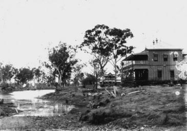 | Keywords: StateLibQld 1 138587 Leo Hotel moving along Lime Street, Clermont, 1917.jpg  en Leo Hotel moving along Lime Street Clermont 1917 Following the flood that virtually destroyed Clermont in December 1916 the people of Clermont voted to move the town to higher ground 'Each building was raised on jacks and timber rails laid underneath it and for about one hundred metres ahead A steam traction engine then winched the building slowly along the track When it came to the end of the track the rails were collected and laid down in front for another hundred metres Considering the size of the task of moving a hotel the procedure did not take long The contract to move the Grand Hotel was signed in June 1917 the steam engine began its work on 16 August and by 15 September the Grand was opposite its new site on the corner of Capella and Daintree Streets While the hotel was 'on the road' the boarders had their meals served in the dining room as usual and slept in their rooms each night The other hotels were also moved in this way although the Commercial being so large and built in an 'L' shap plan was sawn in half and moved in two sections Other buildings moved by traction engine included several houses and Griffin's store ' Information taken from G C Pullar A shifting town glass-plate images of Clermont and its people 1986 Town Hall in background and lagoon on the left 1917 handle 10462/deriv/12273 Item is held by John Oxley Library State Library of Queensland Pullar Gordon C PD-Australia StateLibQld-License Floods in Queensland Hotels and pubs in Clermont Queensland Lagoons of Queensland Steets in Clermont 1917 in Queensland Black and white photographs Transport of buildings |