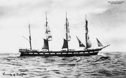 Keywords: StateLibQld 1 148939 County of Dumfries (ship).jpg en County of Dumfries ship <br> Iron ship built in 1878 by Barclay Curle Co Glasgow Dimensions 81 12×11 78×7 16 meters 266'2 ×38'8 ×23'5 and tonnage 1718 GRT 1640 NRT and 1580 tons under deck Renamed Sovinto under Finnish owners 1905 <ref name bruzelius > Cite web Bruzelius Lars Sailing Ships County of Dumfries County of Dumfries The Maritime History Virtual Archives 2000-12-12 http //www bruzelius info/Nautica/Ships/Fourmast_ships/County_of_Dumfries 281878 29 html Mar 9 2011 </ref> handle 10462/deriv/25038 Item is held by John Oxley Library State Library of Queensland Reflist PD-Australia StateLibQld-License County of Dumfries ship 1878 Historical images of square-riggers under sail Black and white photographs |