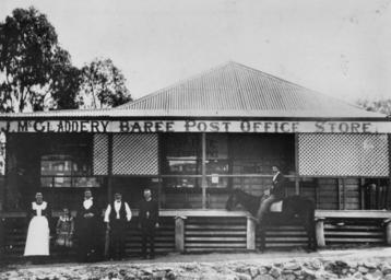 MAKE A MEME View Large Image ...Qld 1 15498 Baree Post Office Store, Mt. Morgan, ca. 1900.jpg en Baree Post Office Store Mt Morgan ca 1900 A group of people are standing outside the store and a gentleman is mounted on a horse The proprietor of the store at the time was J ...