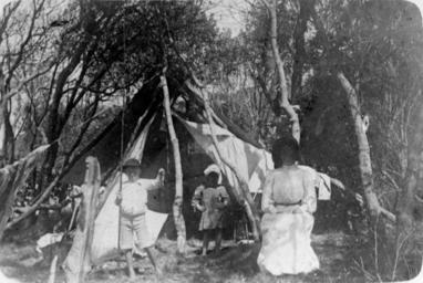 | Keywords: StateLibQld 1 166435 Family camping at Tweed River, New South Wales, 1905.jpg supplied with photograph A woman and two children pose in front of their tent structure The woman sits in a chair the boy holds a fishing rod and displays a fish and the girl stands nearby Trees and bush surround the shelter 1905 handle 10462/deriv/112632 Item is held by John Oxley Library State Library of Queensland PD-Australia StateLibQld-License Children of Queensland Families of Australia Tents in Australia Trees in Australia 1905 in Australia Tweed River New South Wales Black and white photographs |