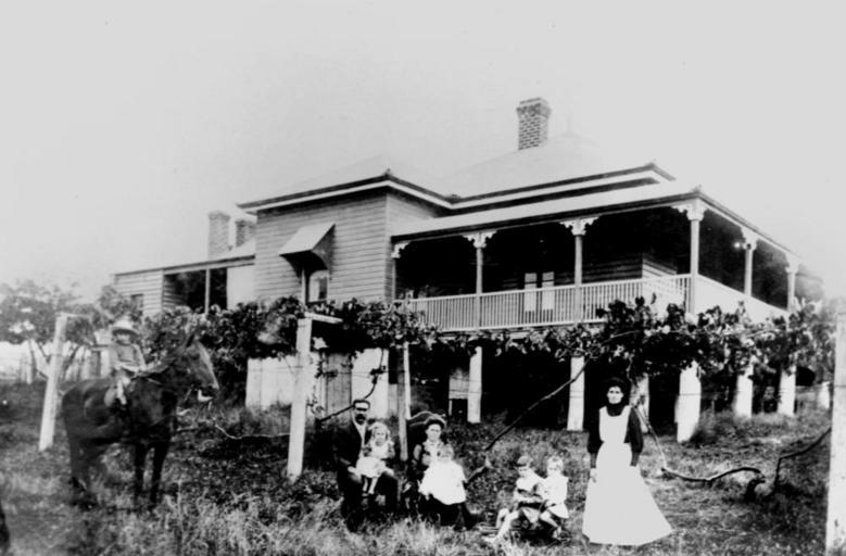 Keywords: StateLibQld 1 177499 Bonner family in front of their home.jpg en Bonner family in front of their home <br /> According to the source information this house is located in Liston New South Wales <br /> Bonner family pose in the garden in front of their home Mr and Mrs Bonner are seated under a vine and have children on their laps A child sits on a horse two children are on a tricycle and a woman stands to the left The verandah windows roof and chimneys of the house are prominent 1910 handle 10462/deriv/102339 Item is held by John Oxley Library State Library of Queensland PD-Australia StateLibQld-License Black and white photographs Children of Australia Houses in New South Wales