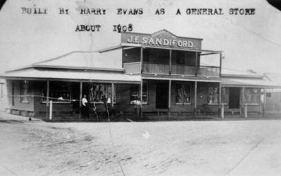 Keywords: StateLibQld 1 200679 General store in Inglewood, ca. 1908.jpg en General store in Inglewood ca 1908 This is the J E Sandiford Federal Store which was built by Harry Evans and is a two storey structure with a balcony on the second floor There are three men posing on the verandah and a bicycle leaning against the shop front The street in front of the store is unpaved circa 1908 handle 10462/deriv/96607 Item is held by John Oxley Library State Library of Queensland PD-Australia StateLibQld-License General stores in Queensland Verandas on Queensland shops 1908 in Australia Black and white photographs Inglewood Queensland |