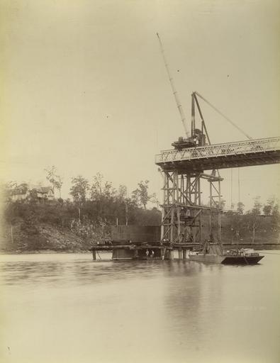 | Keywords: StateLibQld 1 233403 Indooroopilly Railway Bridge approaching the southern bank of the Brisbane River, 1895.jpg en Indooroopilly Railway Bridge approaching the southern bank of the Brisbane River 1895 The second Indooroopilly Railway Bridge was opened on August 17 1895 It replaced the Albert Railway Bridge which was washed away in the 1893 flood The bridge was designed by Henry Charles Stanley Chief Engineer of Railways and at the time was the largest bridge in Australia which was wholly of local manufacture The bridge consisted of two steel spans supported on abutments of masonry and a central concrete pier encased in an iron caisson to low water mark and then built up with masonry to the bearings of the girders Each span was 10 3 m long and each weighed about 610 tonnes A neatly designed footway was carried on the bridge's upstream side Stanley's bridge is still in use today although it has been supplemented with an adjacent bridge to cope with increased traffic Information taken from Janet Hogan Living history of Brisbane 1982 circa 1895 handle 10462/deriv/32124 Item is held by John Oxley Library State Library of Queensland PD-Australia StateLibQld-License Albert Bridge Brisbane construction Boats in Australia Cranes in Australia 1895 in Queensland Black and white photographs |
