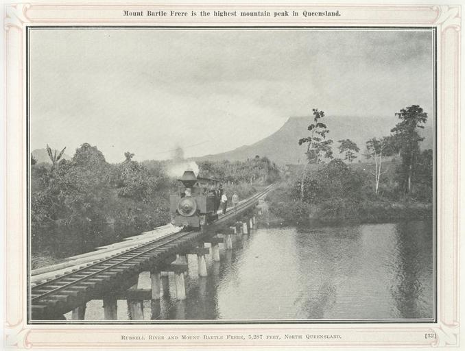 | Keywords: StateLibQld 1 239902 Small steam train crossing the Russell River with Mount Bartle Frere looming in the background, Cairns District, ca. 1924.jpg en Small steam train crossing the Russell River with Mount Bartle Frere looming in the background Cairns District ca 1924 Photograph is taken from a book produced as a Christmas gift from the Premier of Queensland and Mrs Theodore and features a presentation page allowing them to write the recipient's name in a space provided Mount Bartle Frere is the highest mountain peak in Queensland circa 1924 handle 10462/deriv/122421 Copied and digitised from an image appearing in Sunny Queensland its tropical grandeur scenic charms and industrial activities 1924 PD-Australia StateLibQld-License Railway bridges in Queensland Russell River 1924 in Australia Christmas in Australia Black and white photographs Mount Bartle Frere Steam locomotives of Queensland |
