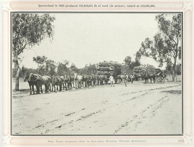 | Keywords: StateLibQld 1 239906 Wool teams delivering wool to the rail-head at Wyandra, Western Queensland, ca. 1924.jpg en Wool teams delivering wool to the rail-head at Wyandra Western Queensland ca 1924 Photograph is taken from a book produced as a Christmas gift from the Premier of Queensland and Mrs Theodore and features a presentation page allowing them to write the recipient's name in a space provided circa 1924 handle 10462/deriv/122425 Copied and digitised from an image appearing in Sunny Queensland its tropical grandeur scenic charms and industrial activities 1924 PD-Australia StateLibQld-License Agriculture in Australia Horse-drawn vehicles in Australia Horse teams 1924 in Australia Black and white photographs Wool bales Wool wagons in Australia Wyandra Queensland Wool teams |