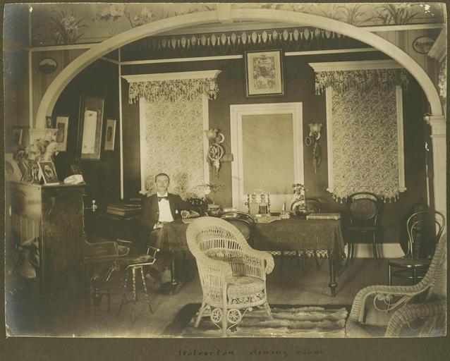 Keywords: StateLibQld 1 242415 Dining room interior Wolverton, home of the Tunbridge family, Townsville, ca. 1895.jpg en Dining room interior Wolverton home of the Tunbridge family Townsville ca 1895 <br /> View of the dining alcove adjacent to the parlour at Wolverton The room is decorated with various wallpapers around the archway and a decorative border strip with a stylised flower design above the picture rail An upright piano with candlesticks on either side is on the left of the room The dining room has wooden floors two windows with fabric blinds and valances in a floral print The valance and edges of the window blinds are decorated with tassels as is the bottom of the table cloth An unidentified gentleman with a dinner jacket and bow tie is seated at one end of the table The table is laid with a cut crystal decanters Dining room chairs are bentwood chairs with cane insets and a pair of wicker armchairs In the centre of the room is a fur floor rug between 1890 1900 handle 10462/deriv/124191 Item is held by John Oxley Library State Library of Queensland PD-Australia StateLibQld-License Building interiors in Queensland Men's clothing of Australia Tablecloths in Australia Interior decoration in Australia Houses in Townsville 1890 in Queensland 19th-century photographs of Queensland Wallpaper Fur carpets
