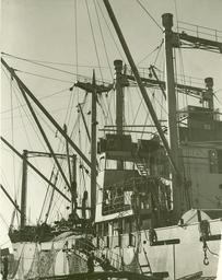 Keywords: StateLibQld 1 251352 Working deck of a cargo ship in port at Brisbane.jpg supplied with photograph Cargo nets are draped over the side of the ship either side of the gangway The deck is filled with ropes and pulleys suspended from cargo booms Some walkways and cabins can be seen above deck handle 10462/deriv/121100 Item is held by John Oxley Library State Library of Queensland Jackman George; Contributor s Queensland Newspapers Pty Ltd PD-Australia StateLibQld-License Barossa ship 1938 Black and white photographs of ships Brisbane River Derricks in Australia Ships in Brisbane Wharves in Brisbane |