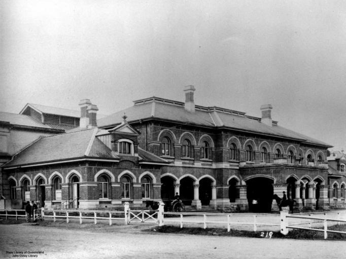 Keywords: StateLibQld 1 47168 Front entrance of Roma Street Railway Station, Brisbane, Queensland, ca. 1888.jpg en Front entrance of Roma Street railway station Queensland ca 1888 The main entrance to the Roma Street railway station around 1888 is a large attractive brick building with arched windows multiple chimneys and a tiled roof A man on a horse and a person on a horse and cart can be seen in front of the entrance circa 1888 handle 10462/deriv/55367 Item is held by John Oxley Library State Library of Queensland PD-Australia StateLibQld-License Roma Street railway station Roma Street Brisbane 1888 in Queensland Black and white photographs