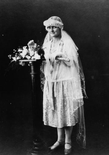 | Keywords: StateLibQld 1 50184 E. Power on her wedding day in August, 1927.jpg en E Power on her wedding day in August 1927 The bride is wearing a blouson top wedding dress with calf-length full lace skirt her veil's headpiece is surrounded by a tulle ruffle 1927-08-01 handle 10462/deriv/57545 Item is held by John Oxley Library State Library of Queensland PD-Australia StateLibQld-License Brides of Australia Wedding dresses in Australia Flower bouquets in Australia 1927 in Australia Black and white photographs 1927 portrait photographs 1920s wedding dresses |